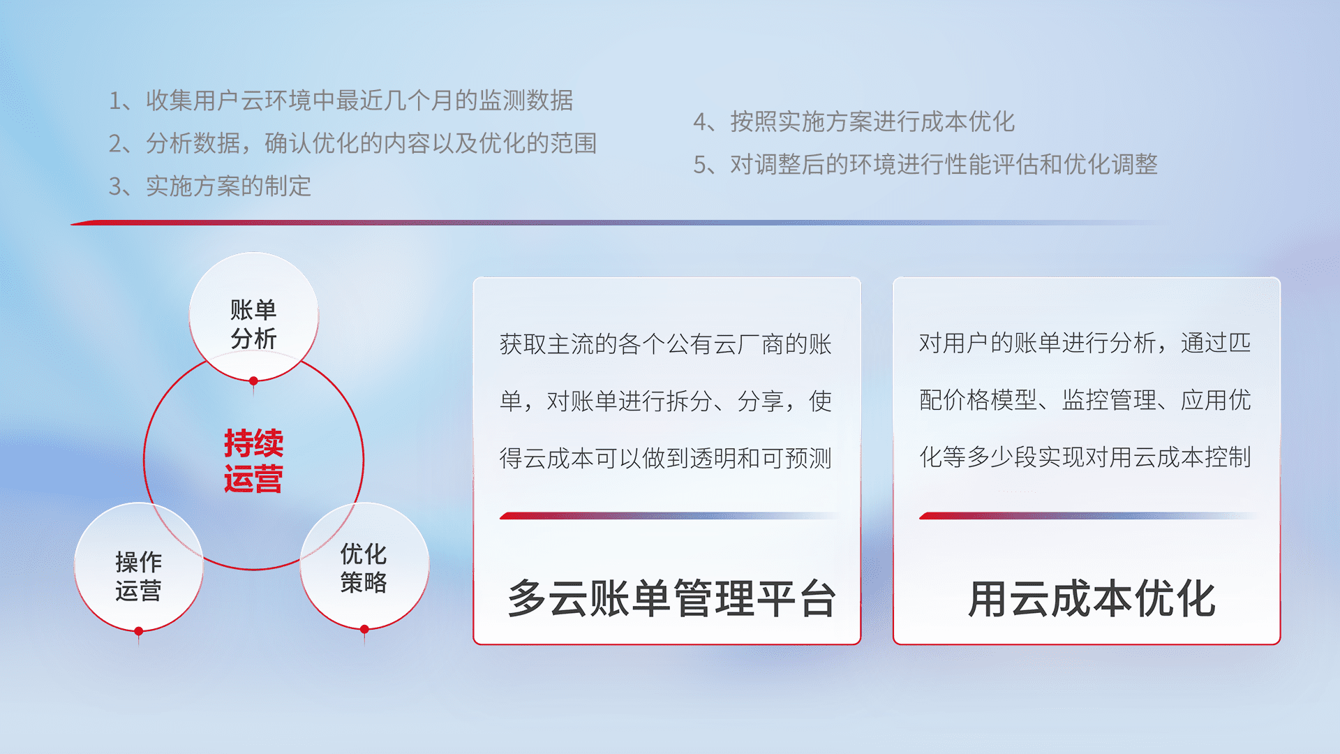 通过多云纳管,,,,以统一的资源数据模型把客户的云资源进行抽象和封装,,,,进而实现对多云资源的统一操作,,保障云资源管理的可靠性、、、稳定性与可用性。。。。量身定制化运维内容,,配置、、开发运维、、、补丁管理、、、备份、、、监控、、、认证和访问管理、、、、审计和日常巡检等,,保障在用云过程中的可靠度,,,稳定度以及高可用率。。。
